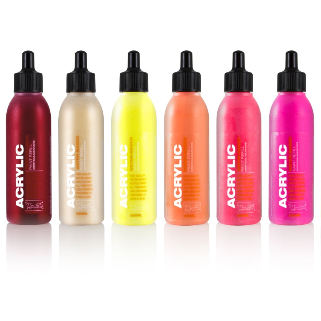 Luminous Colour Shades – Montana Acrylic Paint Refill range is more luminous with the inclusion of the Acrylic fluorescent colours. Ideal for creating great fluorescent effects while matching their equivalent Montana GOLD can colours, the Montana Acrylic fluorescent colours also glow under UV light in darkness.