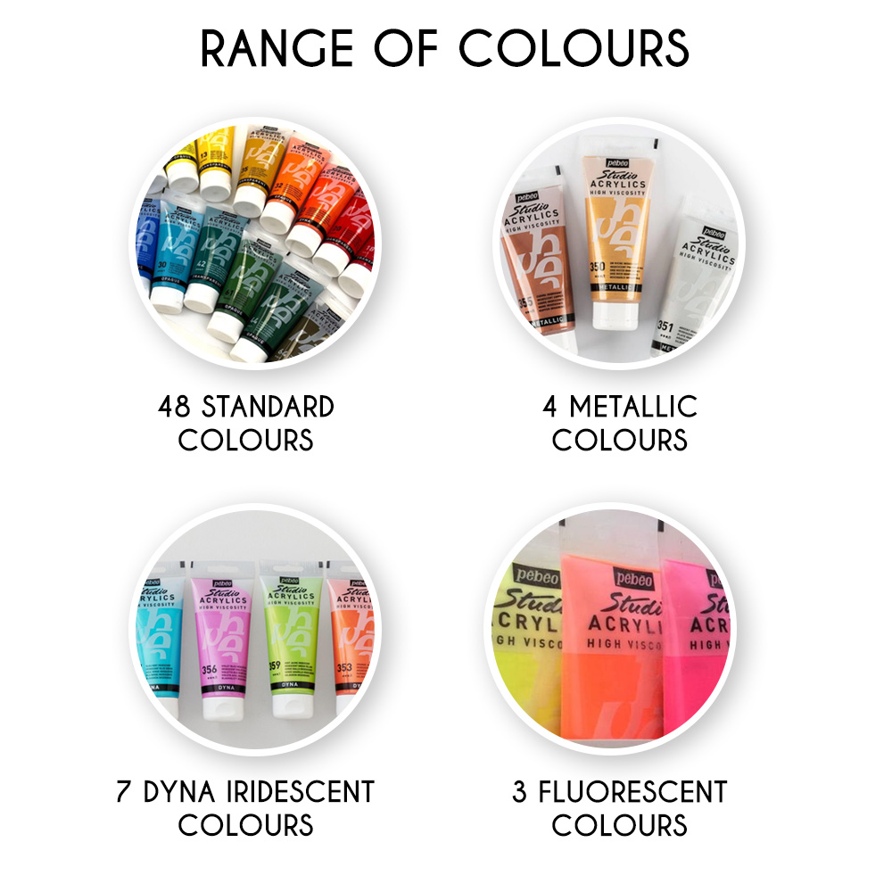 Pebeo Studio Acrylics range consists of 62 intermixable colours; 48 standard colours, which have a satin finish, 4 Metallic colours, 7 Dyna Iridescent Colours & 3 Fluorescent colours. The range is available in 3 sizes; 100 ML Tubes, 250 ML Tubes & 500 ML Jars.
